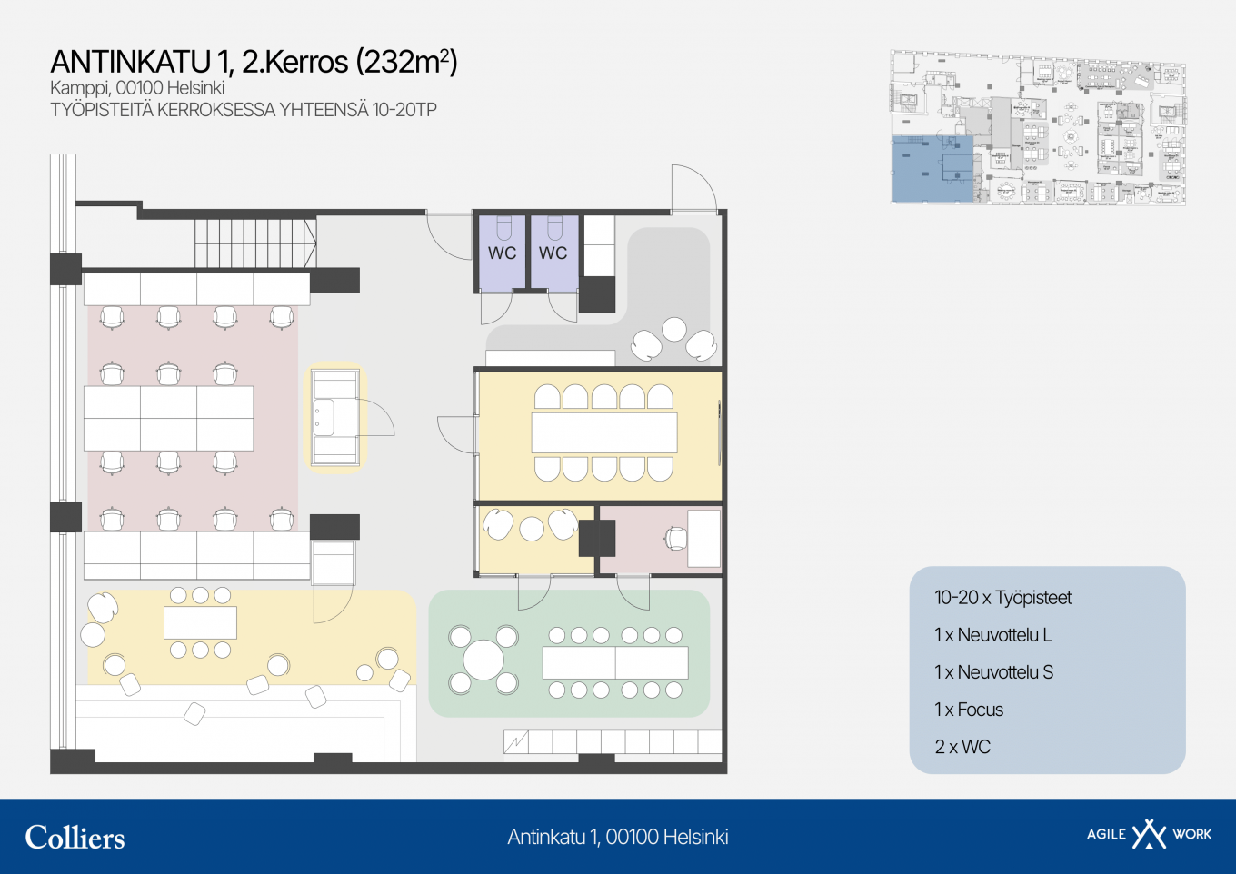 2-4 kerroksissa sijaitseva valoisa toimistotila huippusijainnilla Kampin kattavien palveluiden äärellä. Kerrokset on mahdollista liittää toisiinsa sisäportailla. Tehokas pohjaratkaisu mahdollistaa joustavat tilaratkaisut vuokralaisen tarpeen mukaan. Erikokoiset neuvotteluhuoneet ja monimuotoiset työskentelytilat luovat pohjan toimivaan ja nykyaikaiseen hybridityöhön. Tilaan tulee myös tavarahissi.