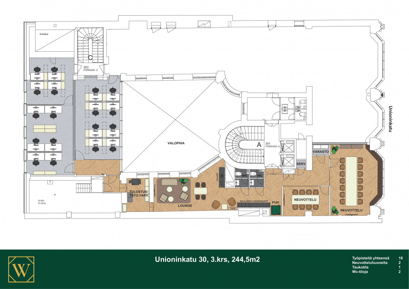 Tämä vuokrattava tila sisältää kolme isoa työtilaa, joihin pystyy sijoittamaan jopa 18 työpistettä. Huoneratkaisu mahdollistaa hyvin esimerkiksi rajauksen eri tiimeille. Lisäksi toimitiloihin kuuluu iso, 12 hengen neuvotteluhuone, pienempi 6 hengen neuvotteluhuone, erillinen hiljaisen työn huone, keittiö ja wc:t. Tiloista aukeaa hurmaavat näkymät Torikortteleille ja Tuomiokirkolle päin.